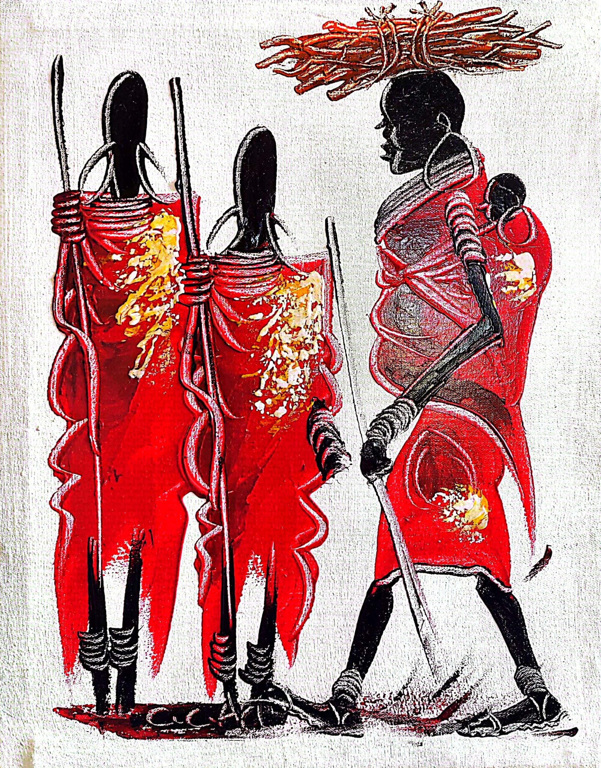 Bring the vibrant spirit of Africa into your space with this hand-painted artwork of Maasai villagers. The painting captures five figures dressed in bold red, and earthy tones, each carrying traditional items like baskets, firewood, and gourds against a dramatic sunset background.
