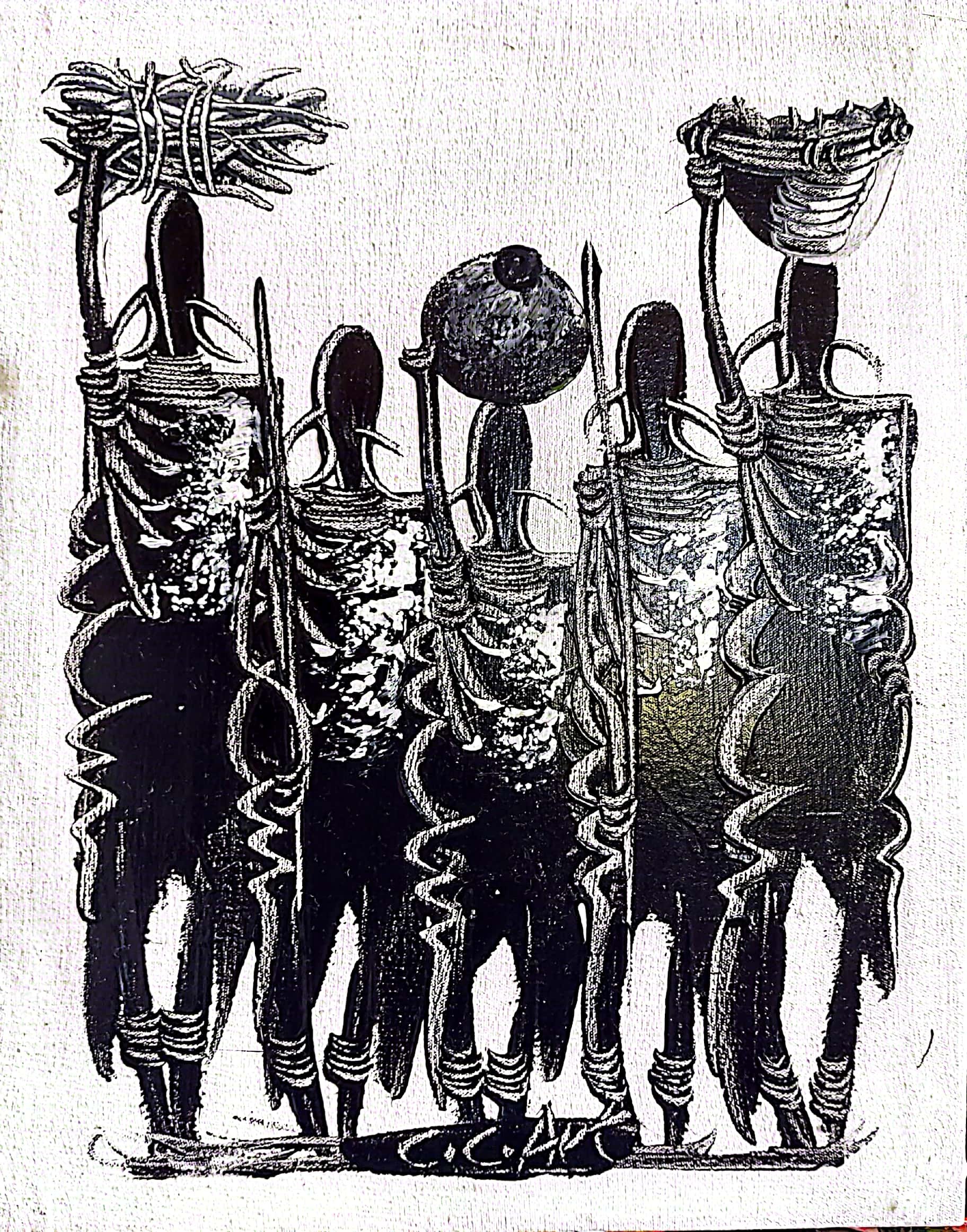 This photo shows a monochrome painting done in black on a light canvas background. The artwork depicts a group of elongated human figures, viewed from the back, carrying traditional items. Some hold baskets, others carry bundles of sticks or gourds on their heads. The figures are stylized, with tall slender bodies and patterned garments, a common feature in African tribal art. The painting emphasizes community life, daily activities, and cultural traditions. The canvas is mounted on an easel, with other artworks and wooden planks visible in the background, suggesting it is in an artist’s studio or gallery space.