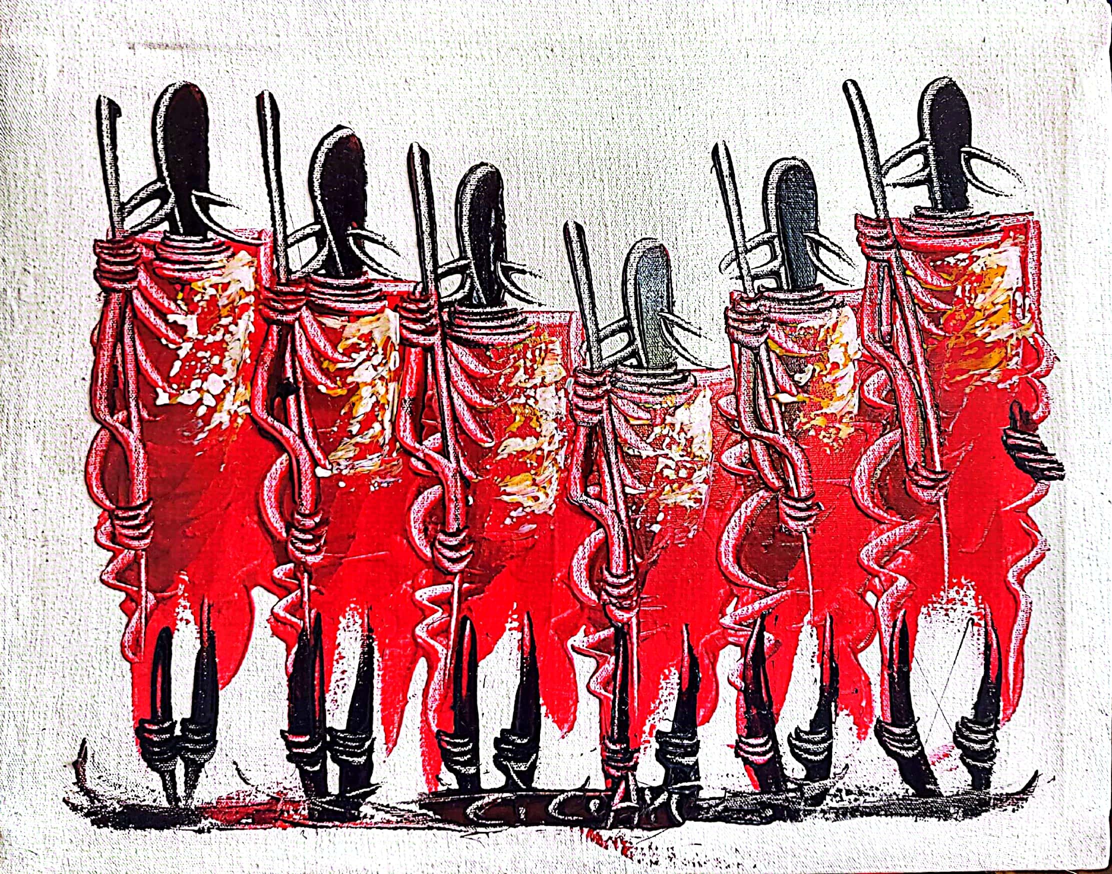 Bring the vibrant spirit of Africa into your space with this hand-painted artwork of Maasai villagers. The painting captures five figures dressed in bold red, and earthy tones, each carrying traditional items like baskets, firewood, and gourds against a dramatic sunset background.