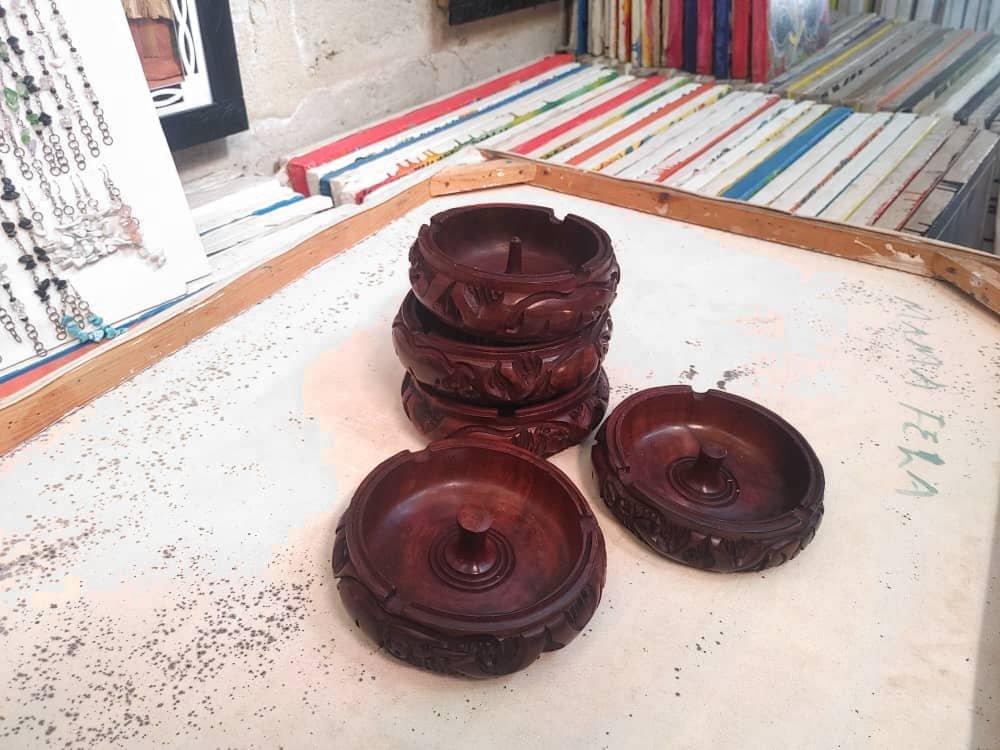 The photo shows a set of four handcrafted wooden ashtrays, beautifully carved with decorative patterns around the sides. The ashtrays are made from polished dark wood, giving them a rich, glossy finish. Three pieces are stacked, while one is placed separately in front, showing the interior design and central holder. The carvings appear detailed and traditional, making the set suitable for home décor, gifts, or shop display.