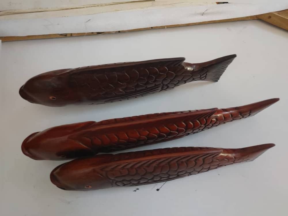 The photo shows a handcrafted wooden fish sculpture placed on a white surface. The fish is carved from a dark, polished wood and features detailed scales, fins, and a slightly open mouth. Its eye is made from a small round inlay, giving it a lifelike expression. In the background, there are several stacked books or boards with different colored edges.
