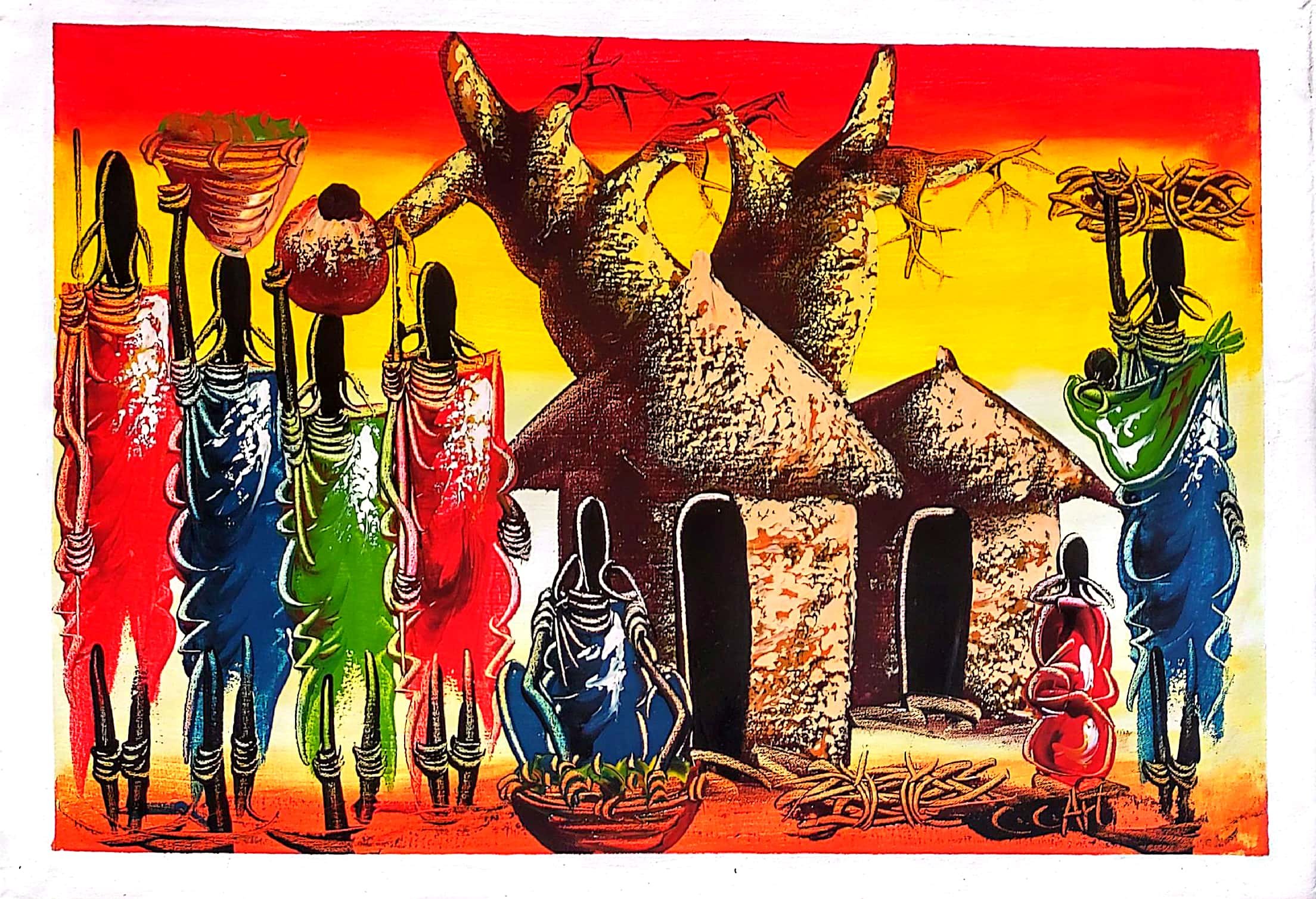 Bring home a piece of authentic African heritage with this hand-painted canvas depicting the Maasai community gathered beneath the majestic baobab tree. The vibrant blend of warm reds, yellows, and earthy tones captures the essence of African sunsets, community, and tradition.