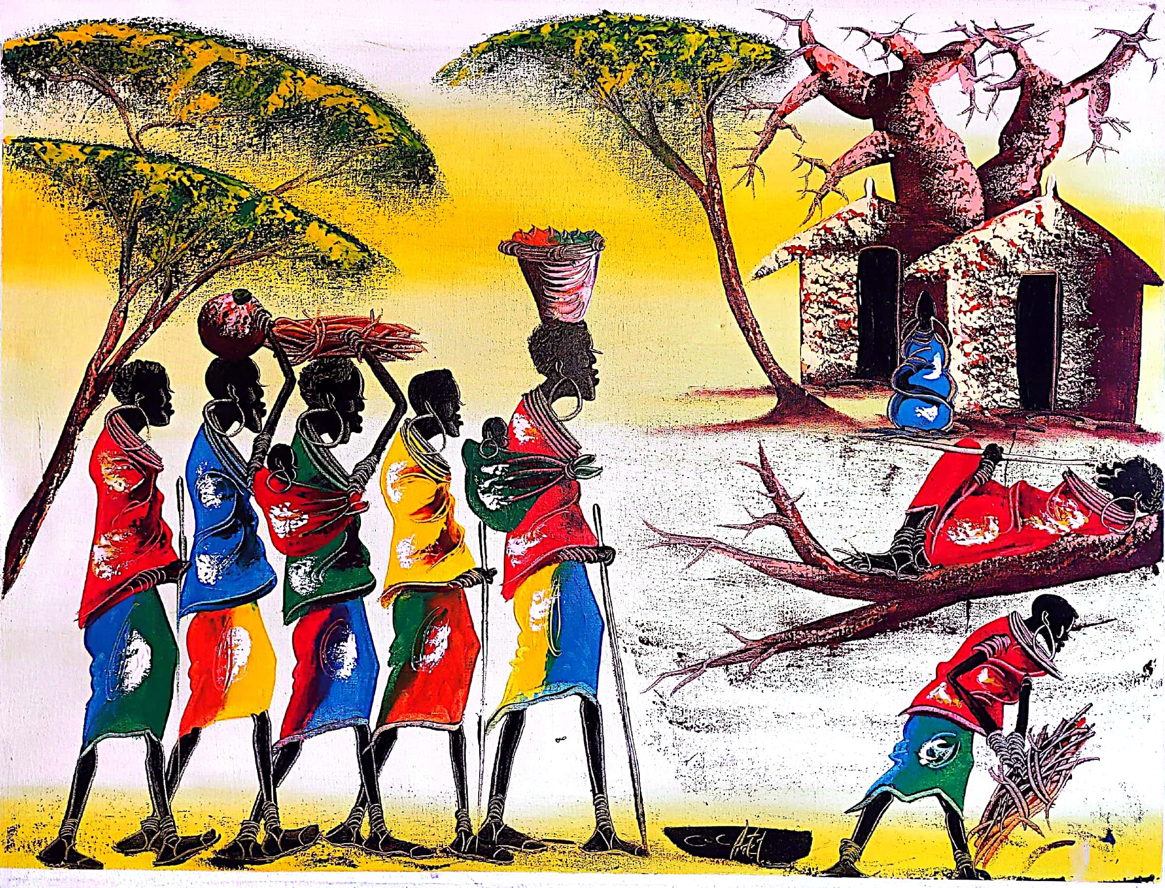 Bring home a piece of authentic African heritage with this hand-painted canvas depicting the Maasai community gathered beneath the majestic baobab tree. The vibrant blend of warm reds, yellows, and earthy tones captures the essence of African sunsets, community, and tradition.