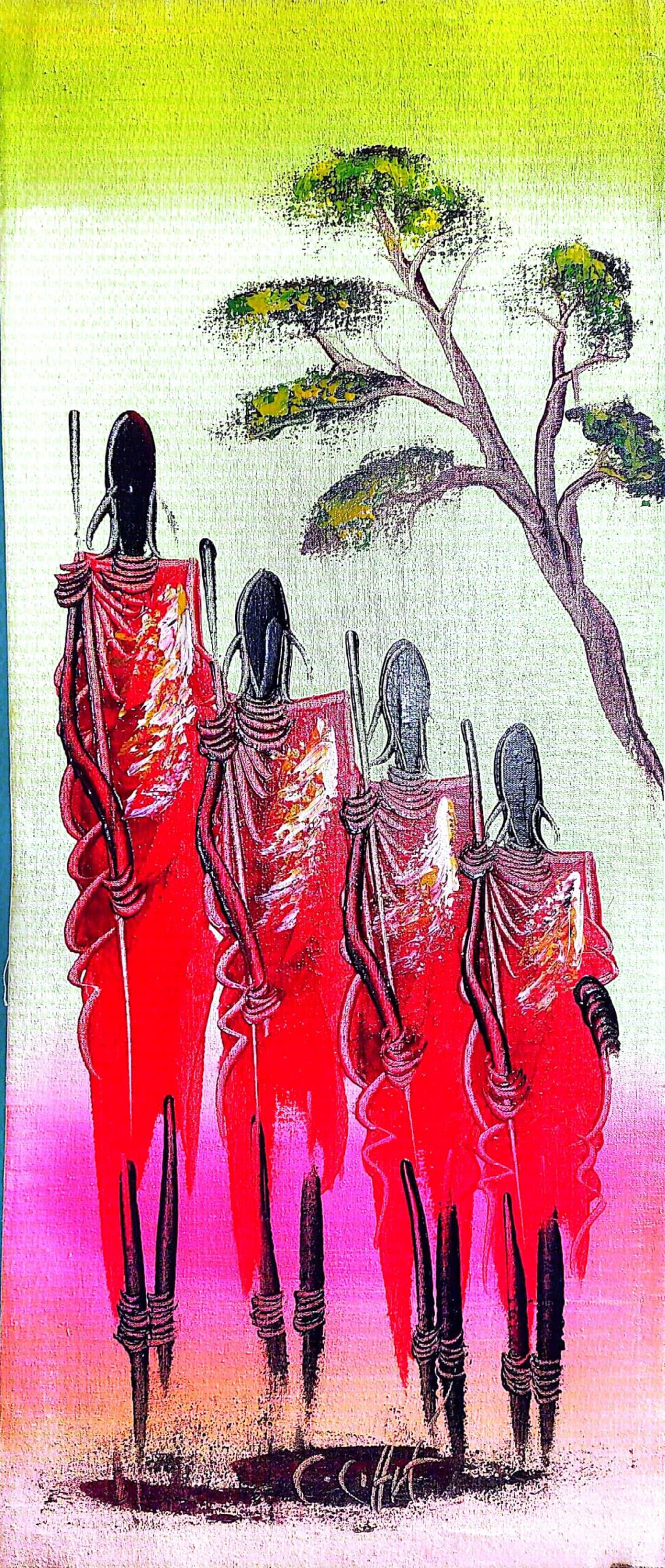 A vibrant hand-painted artwork featuring four Maasai figures in flowing robes of red, Each carries traditional items — a spear, a basket of fruit, and a calabash — symbolizing community, tradition, and daily life. The bold colors against the dramatic sky create a striking balance of culture and artistically