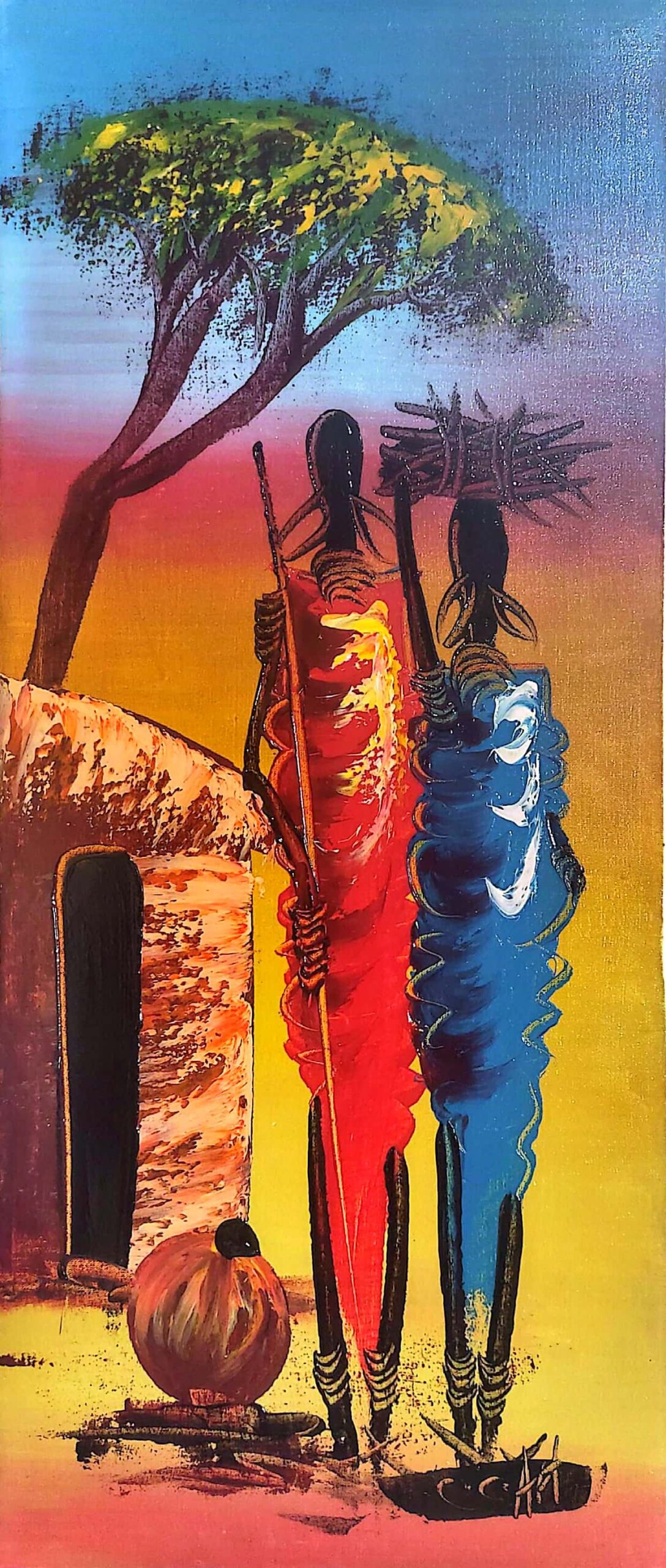 A vibrant hand-painted artwork featuring four Maasai figures in flowing robes of red, blue, and green. Each carries traditional items — a spear, a basket of fruit, and a calabash — symbolizing community, tradition, and daily life. The bold colors against the dramatic sky create a striking balance of culture and artistically