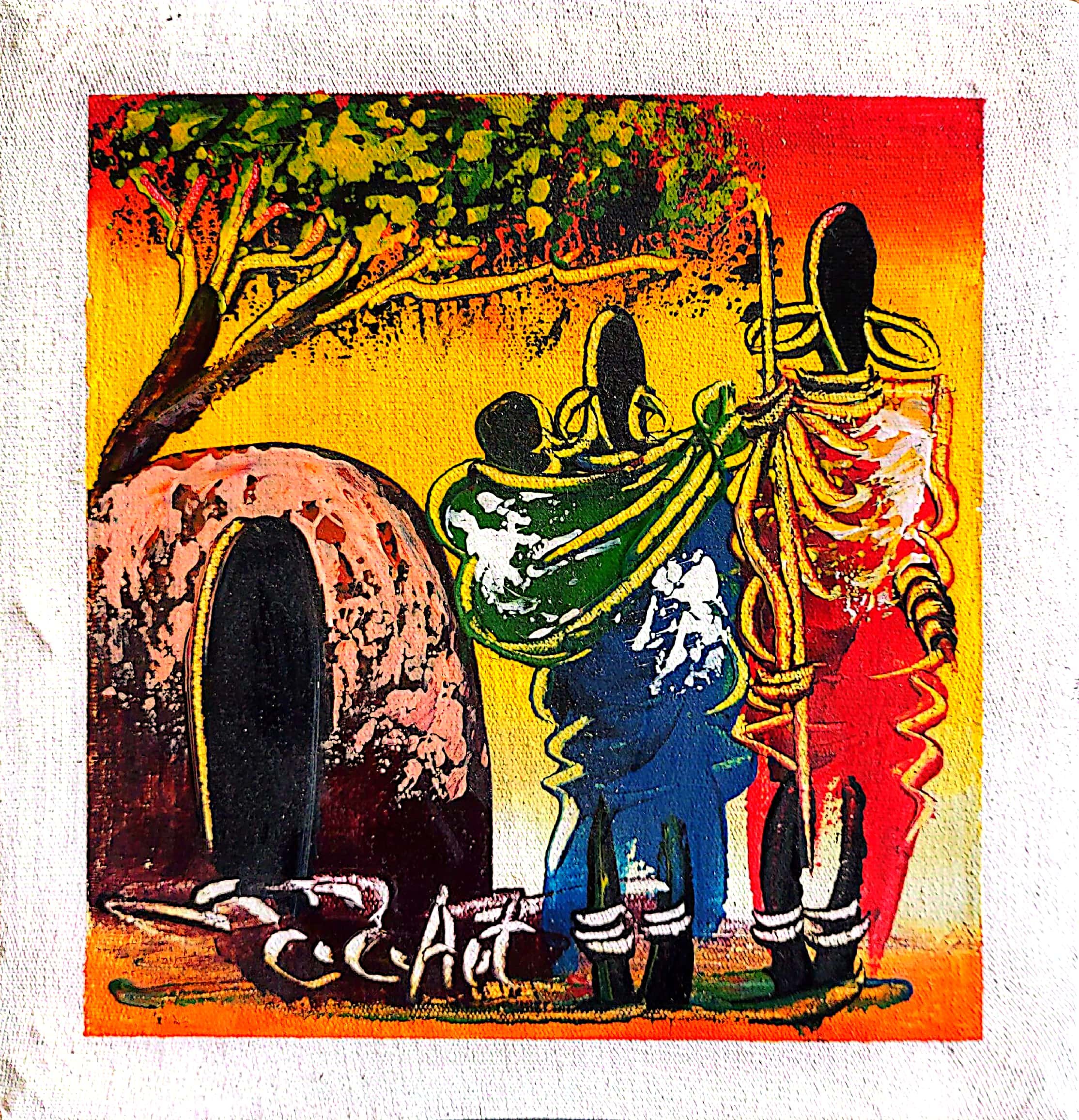 This hand-painted artwork depicts two African women walking together, each carrying traditional baskets and goods on their heads. Their flowing garments are painted in bold red, yellow, and blue hues, symbolizing unity in diversity. The expressive brushstrokes and vibrant background of yellow, green, and red create a lively atmosphere that reflects community life, tradition, and resilience. The elongated black figures and stylized forms are typical of East African art, capturing both movement and rhythm in everyday village scenes.
