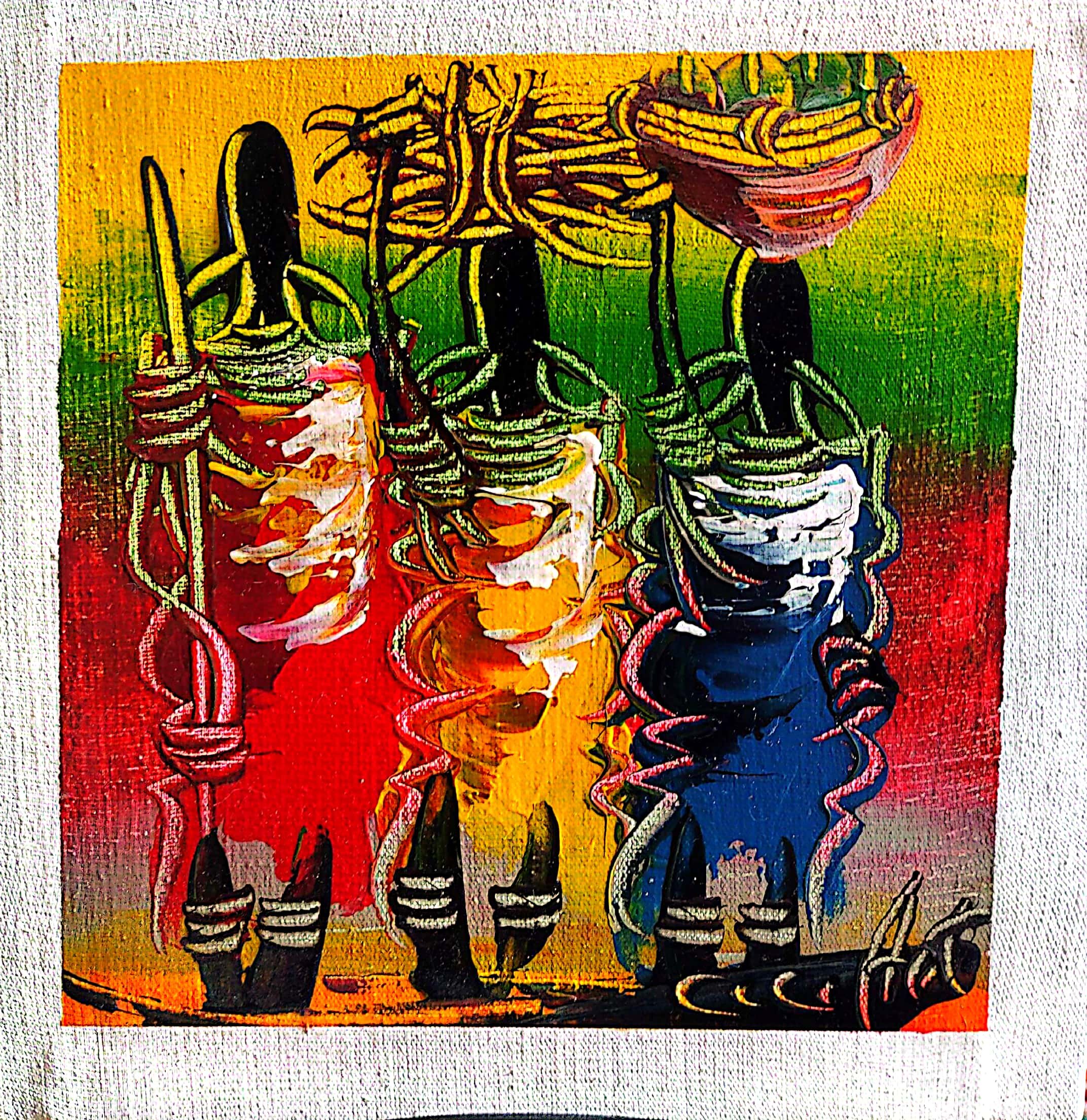 This hand-painted artwork depicts three African women walking together, each carrying traditional baskets and goods on their heads. Their flowing garments are painted in bold red, yellow, and blue hues, symbolizing unity in diversity. The expressive brushstrokes and vibrant background of yellow, green, and red create a lively atmosphere that reflects community life, tradition, and resilience. The elongated black figures and stylized forms are typical of East African art, capturing both movement and rhythm in everyday village scenes.